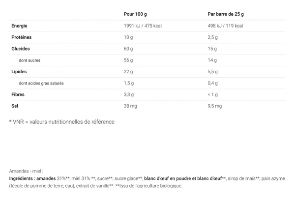 Quel que soit votre pratique sportive, vous apprécierez le NOUGAT BIO OVERSTIM.s avec ses ingrédients bio de hautes qualités : amandes bio (31%) et miel bio (31%). Le NOUGAT BIO associe énergie (100 kcal / barre) et plaisir gustatif grâce à sa recette traditionnelle. La texture moelleuse et fondante du NOUGAT BIO rend son utilisation particulièrement agréable en cours d’effort.