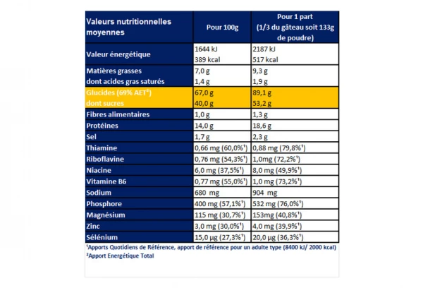 Préparation de farines (farine de blé, gluten de blé, farine de fève, fairne de blé malté, levure, enzymes, antioxydant (acide ascorbique)), sucre, lait fermenté en poudre (15%), fructose, oeufs entiers en poudre, matière grasse végétale (huile de tournesol, sirop de glucose, protéine de lait, antiagglomérant (dioxyde de silicium), stabilisant ( phosphate de potassium)), poudres à lever (bicarbonate de sodium, di-sodium di-phosphate), minéraux (dicitrate de tri-magnésium, sulfate de zinc, sélénate de sodium), sel,vitamines ( B3, B6, B1, B2). Contient du blé, du lait et de l’oeuf.