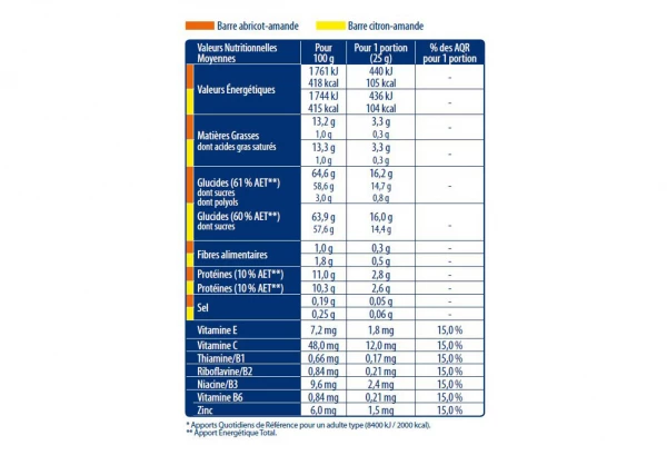 - 6 vitamines : B1, B2, B3, B6, C, et E