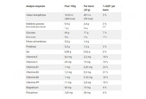 Composition : Sucre, figue 24%, amande 11%, stabilisant : sorbitols, germe de blé 5%, raisin 5%, sirop de glucose, fructose, miel, sirop de sucre inverti, huile de colza, dextrose, fécule de pomme de terre, vitamine B1, B2, B6, C, E (lactose, protéines de lait) et PP, arôme naturel de vanille.