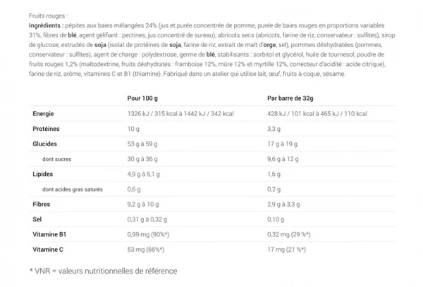 Ingrédients : pépites aux baies mélangées 23.8%(jus et purée de pomme, purées en proportions variables de fraise, framboise et cassis 5%, fibres de blé, agent gélifiant : pectines, jus concentré de sureau), abricots (agent d’enrobage : farine de riz, sulfites), sirop de glucose (sulfites), extrudés de soja (isolat de protéines de soja, farine de riz, extrait de malt d’orge, sel), cubes de pommes séchés 9.6%(sulfites), agent de charge : sirop de polydextrose, germe de blé, stabilisants : sorbitol et glycérol, huile de tournesol, poudre de fruits des bois 1.2%(maltodextrine, fruits (extraits sec 40%) : framboise, mûre et myrtille, correcteur d’acidité : acide citrique), farine de riz, arôme, vitamines C et B1 (thiamine). Fabriqué dans un atelier qui utilise lait, œuf, fruits à coques, sésame.