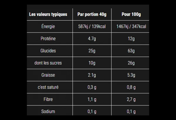 Jus de fruits à base de concentré 36% (raisin, ananas), céréales 21% (riz et soya croquants (farine de riz, isolat de protéines de soja, farine d’avoine, sel, huile végétale, lécithine) (gluten), avoine (gluten)), maltodextrine ( de maïs), fruits secs 12% (dattes), isolat de protéine de soja, émulsifiant (lécithine de soja), fruits lyophilisés 3% (myrtille, cassis), humectant (lactate de calcium), arôme, poudre de jus de sureau
