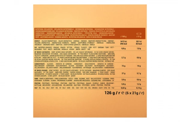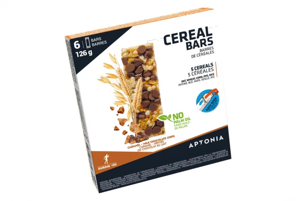 Barre céréalière au caramel et aux pépites de chocolat au lait, aromatisée. Ingrédients : céréales 45% (flocons d’AVOINE* 20,5%, farine de BLE* 8,5%, maïs 6,4%, flocons de SEIGLE* 6,2%, farine de riz 3,7%, extrait de malt d’ORGE* 0,1%), sirop de riz, pépites de chocolat au LAIT 8% (sucre, LAIT entier en poudre, beurre de cacao, pâte de cacao, LACTOSE(LAIT), émulsifiant : lécithines de soja, arôme), sirop de riz déshydraté, huile de tournesol, morceaux de caramel 3,5% (sucre, BEURRE (LAIT), LAIT entier en poudre, LAIT écremé en poudre, sel, émulsifiant : lécithines de tournesol) dextrose, sucre, sel, arôme naturel, gélifiant : pectines, émulsifiant : lécithines de soja, antioxydants (extrait riche en tocophérols). *CONTIENT DU GLUTEN. Peut contenir des traces éventuelles de : ARACHIDES et FRUITS A COQUE.