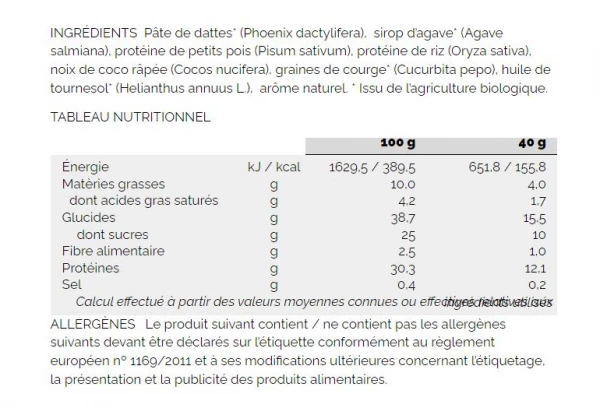 Il s’agit de barres protéinées véganes qui contiennent près de 30 % de protéines végétales, ce qui équivaut à plus de 11 g de protéines par barre. Elles sont enrichies avec des superaliments ou Superfoods.