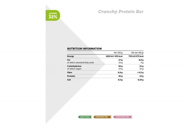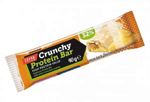- Enrobage au chocolat blanc (33%) (sucre, beurre de cacao, lait entier en poudre, émulsifiant: lécithine de soja, extrait de vanille) caramel (18%) (sirop de glucose, sucre, lait concentré, sirop de sucre inverti, beurre de cacao, eau, humectant: sorbitol; émulsifiants: mono- et diglycérides d’acides gras; sel) protéines du lait, collagène hydrolysé, soja soufflé (7,5%), (protéines de soja isolées, farine de riz, extrait de malt d’orge, sel), humectant: glycérol; protéines de soja isolées, eau, huile de noix de coco, arômes, arômes, arôme naturel de citron, acidifiant: acide citrique; agent de charge: cellulose microcristalline. Peut contenir œufs, arachides et noix.