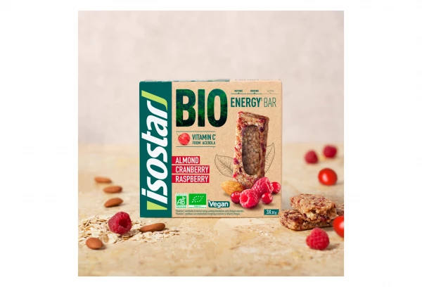 Barre de l’effort d’apport glucidique, issue de l’agriculture biologique, aux amandes, cranberries et framboises, source de vitamine C.