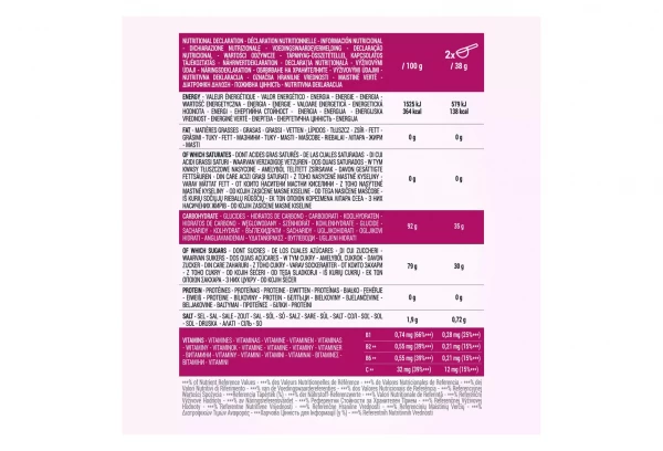 Préparation en poudre pour boisson sport isotonique, d’apport glucidique. Source de vitamines B1, B2, B6 et C, sodium. Goût Fruit Rouge. Ingrédients : Saccharose (61%), dextrose (17%), maltodextrine (14%), acidifiant: acide citrique, citrate de sodium, arôme naturel, chlorure de sodium, denrée alimentaire colorante (concentré de patate douce, radis, pomme, céleri), vitamines C, B2, B6 et B1. Peut contenir des traces de : GLUTEN*, CRUSTACES*, OEUFS*, POISSONS*, SOJA*, LAIT*, CELERI*, SULFITES*, MOLLUSQUES*, LUPIN*, FRUITS A COQUE*. * Allergènes