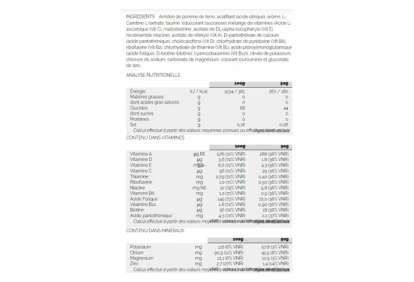 Complément alimentaire en poudre à base de glucides, avec acides aminés, vitamines et minéraux. Avec édulcorant.