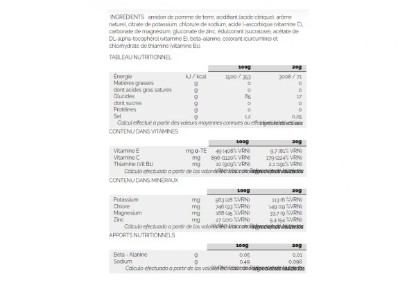 Complément alimentaire en poudre à base de glucides, de vitamines, de minéraux et de bêta-alanine. Avec édulcorant.