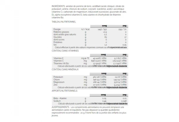 Complément alimentaire en poudre à base de glucides, de vitamines, de minéraux et de bêta-alanine. Avec édulcorant.