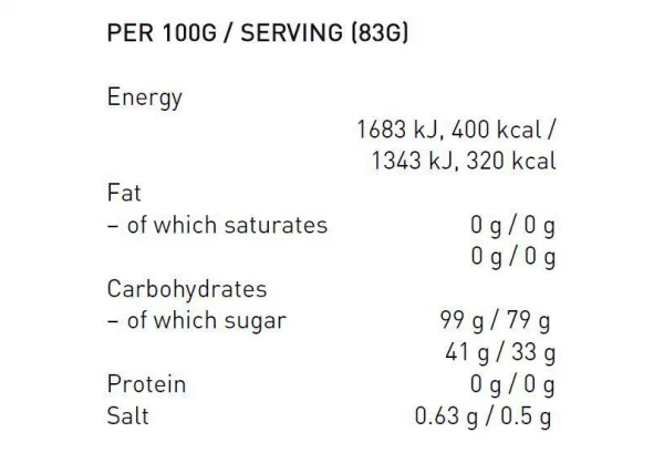 Ingrédients: Maltodextrine, fructose, caféine, pectine, alginate de sodium, chlorure de sodium.
