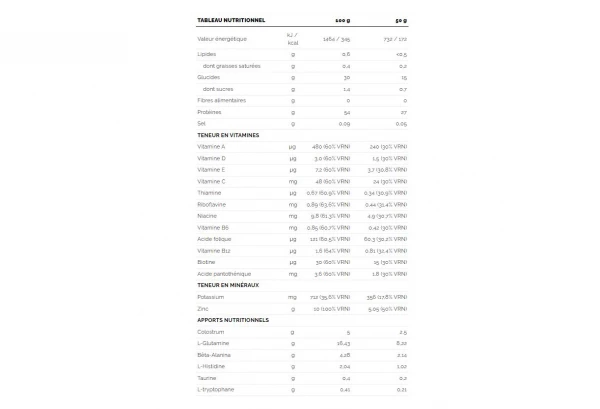 - Du colostrum qui fournit des acides aminés comportant de l’albumine qui est essentielle au métabolisme cellulaire et à la régénération des cellules ainsi que des immunoglobulines qui sont des anticorps qui jouent un rôle primordial dans la protection et la prévention face aux infections pouvant attaquer l’organisme.