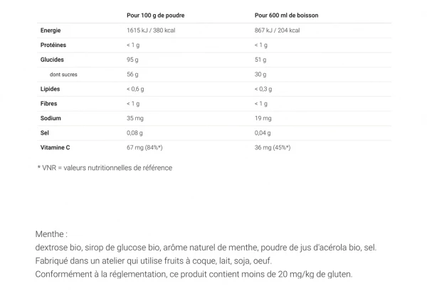 Ingrédients : dextrose(3), sirop de glucose(3), arôme naturel de menthe 2%, sel, vitamine B1 (thiamine). Fabriqué dans un atelier qui utilise fruits à coque, lait, soja, œuf. Conformément à la réglementation, ce produit contient moins de 20 mg/kg de gluten. (3)Ingrédients issus de l’agriculture biologique.