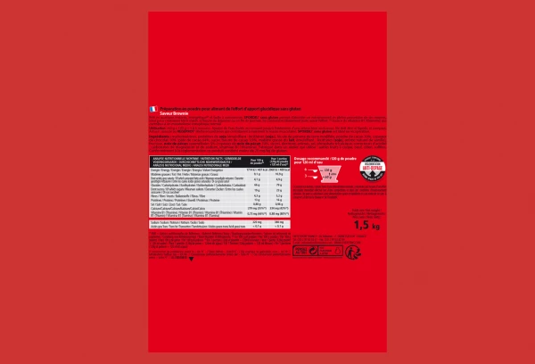 maltodextrines, protéines de soja (émulsifiant : lécithines (soja)), fécule de pomme de terre modifiée, poudre de cacao 10%, copeaux de chocolat 10% (pâte de cacao, sucre, beurre de cacao, matière grasse du lait, émulsifiant : lécithines (soja), arôme naturel de vanille), fructose, noix de pécan caramélisées 5% (noix de pécan 63%, sucre, sucre glace (antiagglomérant : dioxyde de silicium), agent d’enrobage : gomme arabique, sirop de sucre caramélisé), dextrose, arômes, sel, phosphate tricalcique, correcteurs d’acidité : carbonates de magnésium et de sodium, vitamine B1 (thiamine). Fabriqué dans un atelier qui utilise : autres fruits à coques, œuf, céleri, sulfites. Conformément à la réglementation ce produit contient moins de 20 mg/kg de gluten.