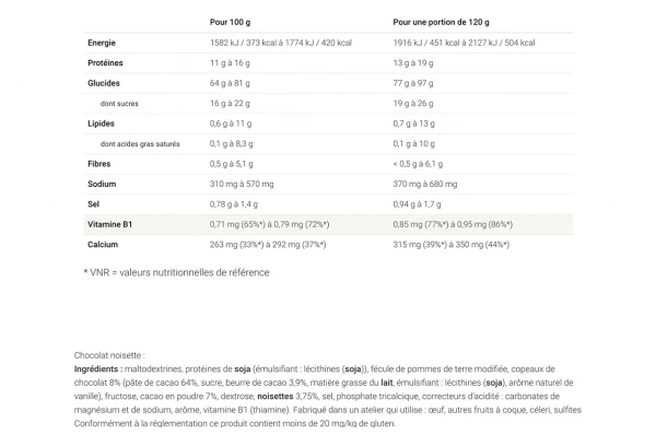 maltodextrines, protéines de soja (émulsifiant : lécithines (soja)), fécule de pommes de terre modifiée, copeaux de chocolat 8% (pâte de cacao, sucre, beurre de cacao, matière grasse du lait, émulsifiant : lécithines (soja), arôme naturel de vanille), fructose, cacao en poudre 7%, dextrose, noisettes 3,75%, sel, phosphate tricalcique, correcteurs d’acidité : carbonates de magnésium et de sodium, arôme, vitamine B1 (thiamine). Fabriqué dans un atelier qui utilise : œuf, autres fruits à coques, céleri, sulfites. Conformément à la règlementation ce produit contient moins de 20 mg/kg de gluten.