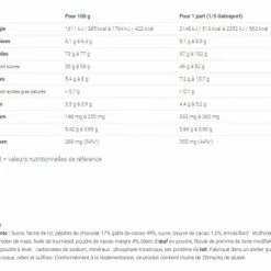 Maltodextrines, protéines de soja (émulsifiant : lécithines (soja)), fécule de pommes de terre modifiée, copeaux de chocolat 8% (pâte de cacao, sucre, beurre de cacao, matière grasse du lait, émulsifiant : lécithines (soja), arôme naturel de vanille), fructose, cacao en poudre 7%, dextrose, noisettes 3,75%, sel, phosphate tricalcique, correcteurs d’acidité : carbonates de magnésium et de sodium, arôme, vitamine B1 (thiamine). Fabriqué dans un atelier qui utilise : œuf, autres fruits à coques, céleri, sulfites. Conformément à la règlementation ce produit contient moins de 20 mg/kg de gluten.