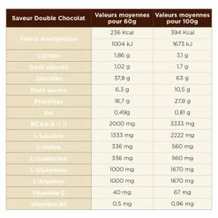 Complexe tri-source de protéines natives de lait [Pur concentré de lactosérum issu de lait obtenu par ultra-filtration, isolat de lactosérum microfiltré (lait, soja), hydrolysat de protéines de lactosérum (lait)], poudre de cacao maigre (CHO), maltodextrine, AMINOLISE 1.4% [Fibres d’acacia Fibregum™, complexe d’enzymes digestives issues de fermentation (amylase, protéase, lactase, lipase, cellulase), extrait de papaye titré en papaïne, extrait d’ananas titré en bromélaïne], arômes naturels, carbonate de calcium, édulcorants : acésulfame de potassium, sucralose ; vitamines B2, B3, B5, B6 et B12.
