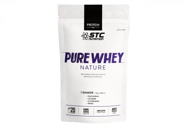 PURE WHEY Nature est un concentré de lactosérum, qui contient 80% de protéines natives de lait, soit 20 g par portion, dont 4.8 g de BCAA et a une faible teneur en sucres et en matières grasses.