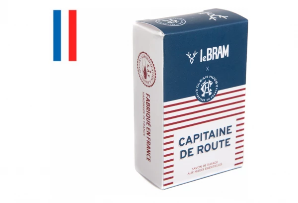 Savon Capitaine de route. Que du naturel, des huiles essentielles bio aux vertus calmantes et désinfectantes, le tout fabriqué en France ! Ce savon de rasage au parfum frais a été spécialement formulé en collaboration avec la marque Clean Hugs. Pour le corps comme pour le visage, la glycérine naturelle assure un rasage confortable et une hydratation idéale aux vrais forçats de la route.
