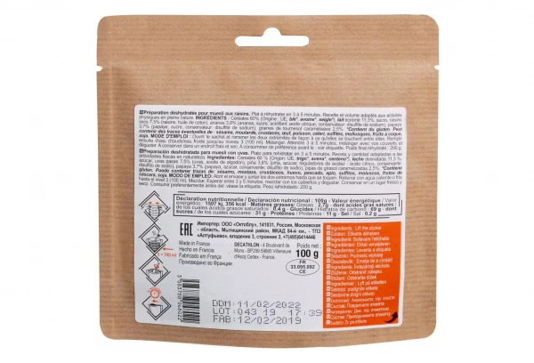 356 kcal d’énergie dans 100 g (poids déshydraté). Poids final réhydraté : 200 g. Réhydratation à froid possible.