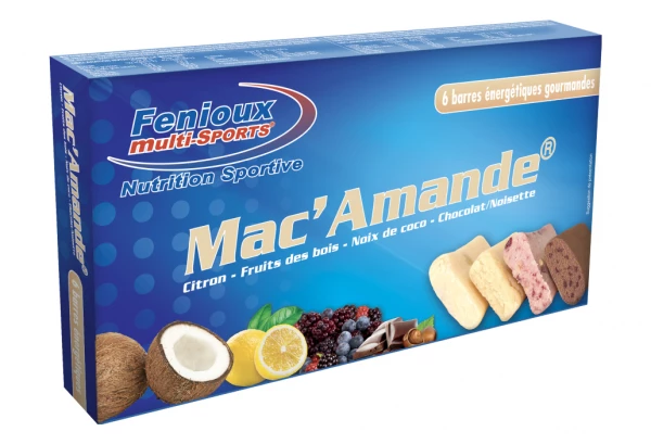 Mac’Amande Chocolat (Sucre, Amandes 28.5%, Sirop de glucose, Chocolat noir 10.2% (pâte de cacao, sucre, beurre de cacao, émulsifiant : lécithine de soja, arôme naturel de vanille), Stabilisants : glycérine et sorbitol, Cacao en poudre 3.7%, Poudre de maca 0.2%, Conservateur : sorbate de potassium, Vitamine B2, Vitamine B1), Mac’Amande Citron (Sucre, Amandes 31.5%, Lactose, Cubes d’écorces de citron confits 4.4% (cubes d’écorces de citron, sirop de glucose, saccharose, conservateurs : sorbate de potassium, anhydride sulfureux, correcteur d’acidité : acide citrique), Edulcorant : sorbitol, Sirop de glucose, Miel, Stabilisant : glycérine, Jus concentré de citron, Poudre de maca 0.2%, Conservateur :sorbate de potassium, Arôme naturel, Vitamine B2, Vitamine B1), Mac’Amande Fruits des bois (Sucre, Amandes 27% Pépites à la mûre et à la myrtille 8% (sucre, purée de mûre 38%, purée de myrtille 27%, pomme, fibres d’ananas, épaississants : alginate de sodium, dicalcium phosphate, arôme, correcteurs d’acidité : E330, E575, colorants : charbons végétal, anthocyanes), Sirop de glucose, Stabilisants : sorbitol, glycérine, Graines de sarrasin, Maltodextrines, Miel, Colorant : rouge de betterave, Arôme (lactose), poudre de maca 0.2%, Conservateur : sorbate de potassium, Vitamine B1), Mac’Amande Noix de coco (Sucre, Amandes 26%, Sirop de glucose, Noix de coco râpée 7%, Lactose, Edulcorant : sorbitol, Sucre, Stabilisant : glycérine, Poudre de maca 0.2%, Arôme, Conservateur : sorbate de potassium, Vitamine B1)