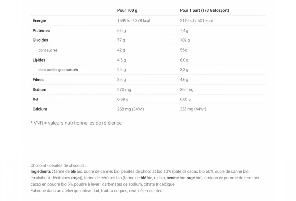 Sucre*, farine de blé*, pépites de chocolat* 10% (pâte de cacao*, sucre de canne*, émulsifiant : lécithines (soja)), céréales *(riz*, blé*, orge*), huile de tournesol désodorisée*, cacao en poudre* 5%, poudre à lever : bicarbonate de sodium, citrate tricalcique, maltodextrines*, vitamine B1 (thiamine). *ingrédients issus de l’agriculture biologique. Fabriqué dans un atelier qui utilise : lait, fruits à coques, œuf, céleri, sulfites.