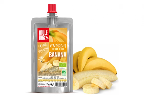 La pulpe de fruits MuleBar Bio & Vegan Banane garantit un apport d’énergie rapide conditionné dans un emballage refermable ultra pratique : bouchon pour une prise en plusieurs fois, et peu encombrant : se range facilement dans une poche (maillot, short, sac à dos, etc …). Cette pulpe de fruits de 65 g de banane est certifiée Bio et Vegan.