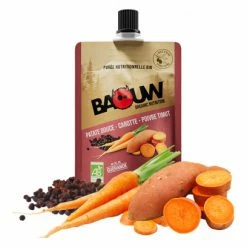 Un velouté de patate douce, d’orange, de carotte, d’huile d’olive, de fruit de la passion, de sel de Guérande, de poivre Timut (au goût de pamplemousse)… Très gourmande, cette purée nutritionnelle de apporte l’équivalent en énergie d’une barre. Gourde à 80% d’origine végétale (canne à sucre) avec un bouchon refermable et pratique.