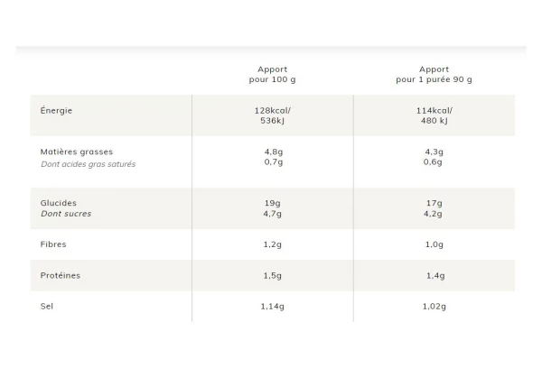 Purée de patate douce* 73,27%, jus d’orange*, purée de carotte* 6,65%, farine de patate douce* 4,89%, huile d’olive vierge extra*, jus de fruit de la passion*, sel de Guérande 0,5%, estragon en poudre*, curcuma en poudre*, poivre timut en poudre* 0,05%, jus de citron concentré*.