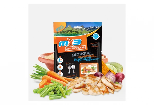 Avec sa viande et ses légumes méditerranéens délicatement épicés, ce couscous au poulet lyophilisé fera immanquablement voyager tes papilles ! Son association de viande maigre, de légumes et d’un féculent en fait un plat très équilibré après une journée de marche.