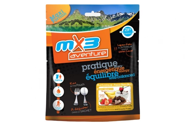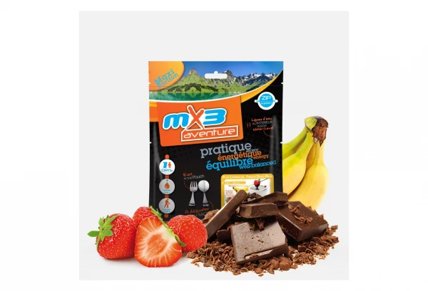 La fondue au chocolat et ses crousty fruits lyophilisée est un délicieux dessert lyophilisé à base de cacao et de fruits croustillants (banane et fraise) pour bien terminer un repas énergétique.