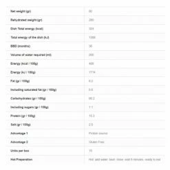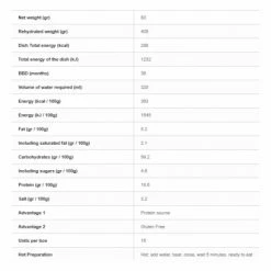 Purée de pommes de terre déshydratée 83% (flocons de pommes de terre, LAIT ½ écrémé (SOJA), sel), MORUE cuisinée lyophilisée 8,7% (POISSON, LAIT ½ écrémé (SOJA), court bouillon (CELERI), épices et aromates, huile d’olive), matière grasse (huile de tournesol, sirop de glucose, protéines de LAIT), fumet de POISSON (POISSON, sel, sucre, maltodextrine, huile de tournesol et de palme, arômes (CELERI), levure, acidifiant : acide citrique, légumes, fécule, extrait de vin blanc, épices et aromates), sel, épices et aromates.