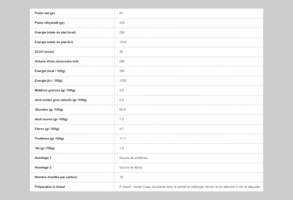 Semoule de BLE dur 76.2% (GLUTEN), poulet cuisiné lyophilisé 8,7% (poulet, concentré de tomate, oignons, bouillon de volaille (OEUF), légumes, épices (MOUTARDE) et aromates), légumes 8,2 % (pois chiches, carotte, courgette), raisins secs, bouillon de volaille (sel, sucre, arômes (ŒUF), graisse et viande de poule, levure, épices et aromates, antioxydant: extrait naturel de romarin), sel, épices.