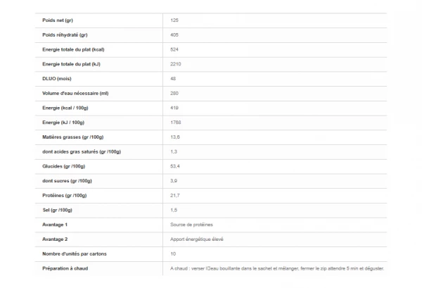 Pâtes précuites 53,6% (GLUTEN), matières grasses (LAIT), poulet cuit lyophilisé 15% (EGG), légumes (courgette 6%, oignons), fécule de pomme de terre, sel, épices et aromates.