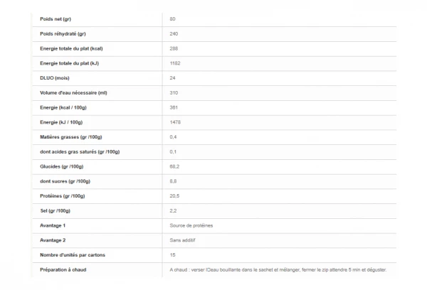 De vrais morceaux de poulet nappés d ‘une délicieuse sauce aux champignons déshydratée. « Voyager » lyophilise vos plats avec le plus grand soin pour offrir une qualité optimale tout en respectant l ‘environnement.