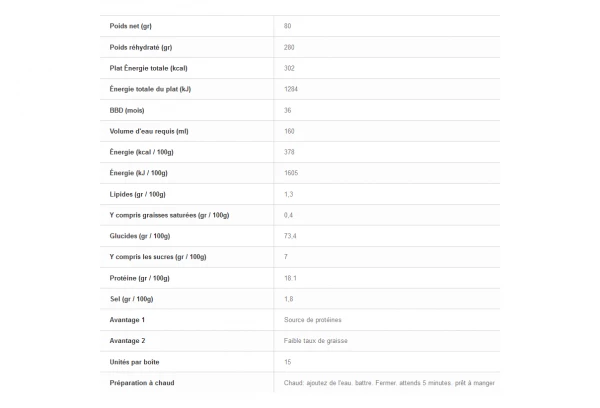 Riz précuit 69,6%, poulet lyophilisé 12,5% (EGG), tomate, oignons, poivrons, sel, herbes provençales, piment 0,1%.