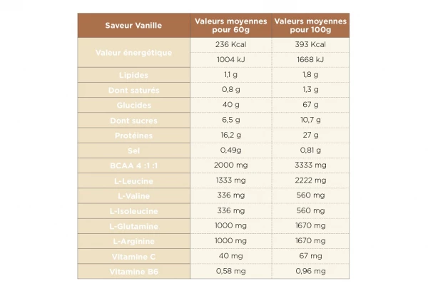 - 16,2g* de protéines : répare et maintient le tissu musculaire