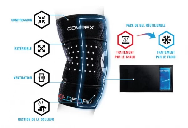 Le traitement COMPEX HOT/COLD contribue à atténuer la douleur et l’œdème, à accélérer la guérison grâce au pack de gel chaud/froid anatomique et mobile, maintenu en place par un manchon compressif