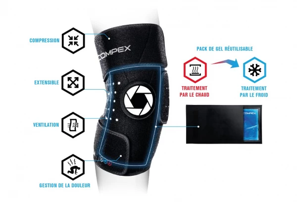 Le traitement COMPEX HOT/COLD contribue à atténuer la douleur et l’œdème, à accélérer la guérison grâce au pack de gel chaud/froid anatomique et mobile, maintenu en place par un manchon compressif.